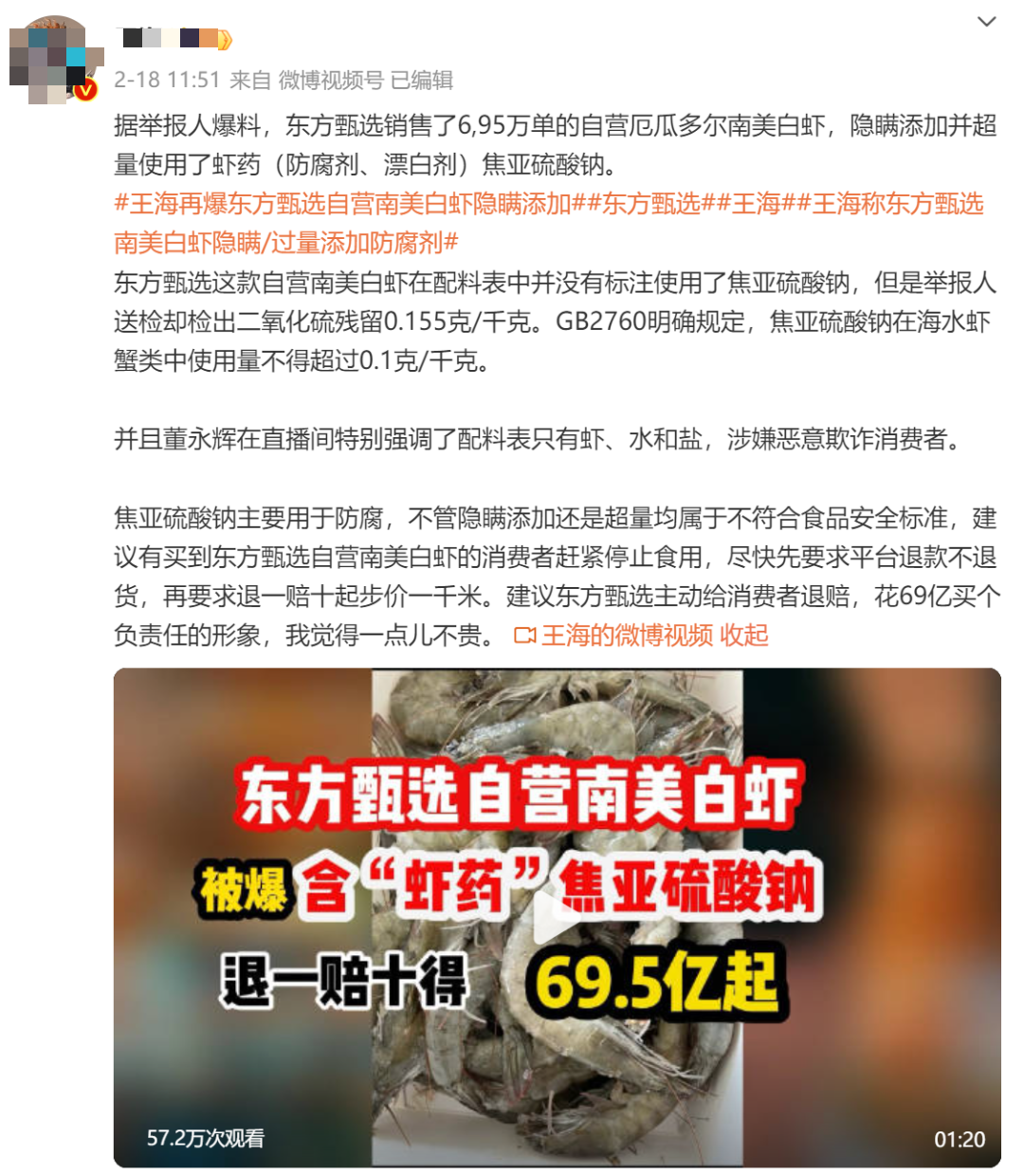 2月18日,知名打假人王海在社交平臺(tái)賬號(hào)上發(fā)布視頻稱,東方甄選自營(yíng)厄瓜多爾南美白蝦隱瞞添加并超量使用焦亞硫酸鈉,涉嫌欺詐消費(fèi)者。